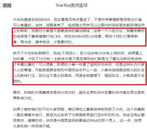 正如媒体人StarXia澳洲篮球分析:“可以想象,即便和小崔一样拿了篮网双向合同,但这种队内不服人心的事情,可能就是蔡老板(蔡崇信)和中国球迷会开心一些。小曾(曾凡博)会继续面临极大的队友以及教练打压,因为这不是水到渠成,而是老板意愿下,强扭的瓜大概率是不会甜的。”