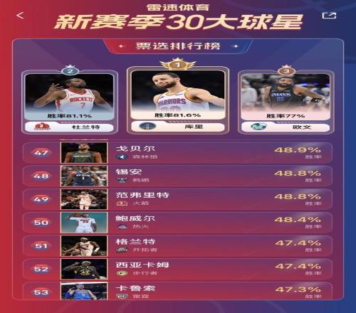 截止至活动次日10月15日的20:00,相比昨日的排名,库里在今日反超杜兰特,成为老哥们心目最受青睐的球星,东契奇则是跌出了前三,名次由目前仍在养伤的欧文取代,欧文的飘逸打法也是粉丝众多,中国球员杨瀚森被超级球星詹姆斯反超,但依旧还在前十的行列中。
