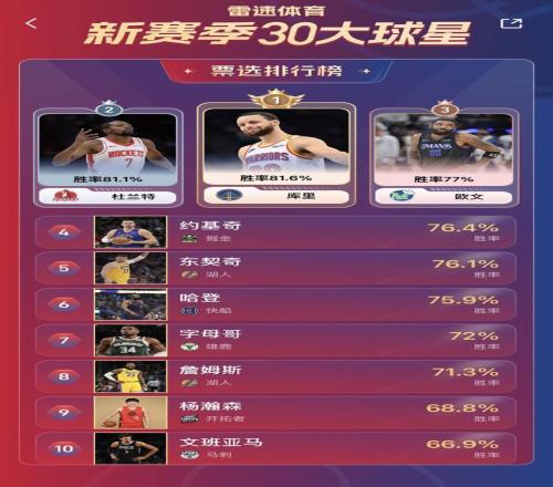 雷速NBA新赛季30大球星即时排名:库里反超KD升至第一