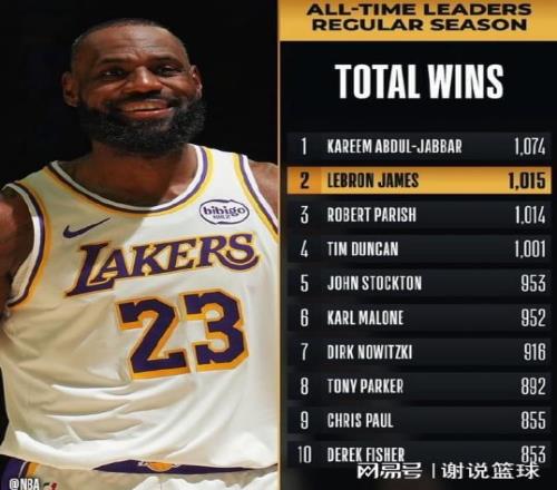 而湖人结束客场之旅后,可谓是三喜临门,首先詹姆斯迎来新里程碑,自从他进入NBA联盟以后,已经取得1015场胜利,这让詹姆斯超越绿军名宿帕里什,独占历史第二位置,仅次于同是湖人传奇的贾巴尔。如果詹姆斯继续球员生涯,预计在下赛季初期,他很可能超越贾巴尔,在这个榜单霸占头名,湖人官方也晒出图片,向詹姆斯表达了祝贺。